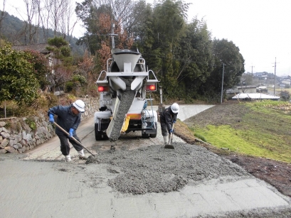 私道拡幅工事の基礎(擁壁、石垣積及び路盤工)ができたので、最後の仕上げコンクリート舗装をしております。全て手作業、晴天に恵まれ汗だくで作業しました。